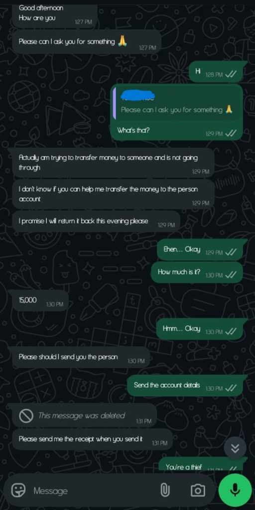 Scammers are calling or messaging users pretending to be part of a meeting or claiming someone needs urgent help. Then, they’ll ask you to send a code to “confirm” your identity or to “join” a meeting. In other cases, they may say a friend or relative is stranded and needs urgent financial help, and they will pay back once their account is going through, usually 10, 15, 20 or 30, 000 naira. Some notable bank account name being used for this scam are is 0394733065 Ibrahim Simeon, Smartcash Payment Service Bank, 6702846370 Jimoh Aminat Moniepoint which may belong to POS outlets. We presented some chat screenshots below: